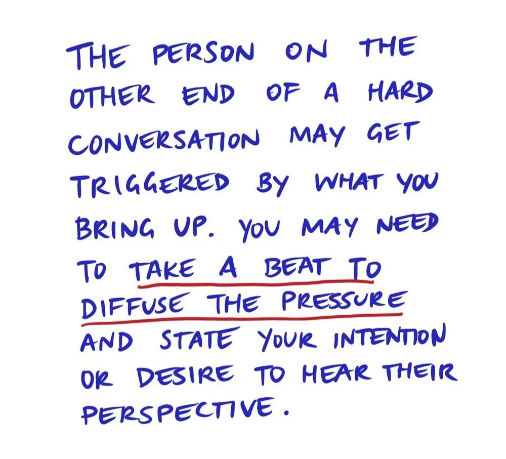 The person on the other end of a hard conversation may get triggered by what you bring up. You may need to take a beat to diffuse the pressure and state your intention or desire to hear their perspective.