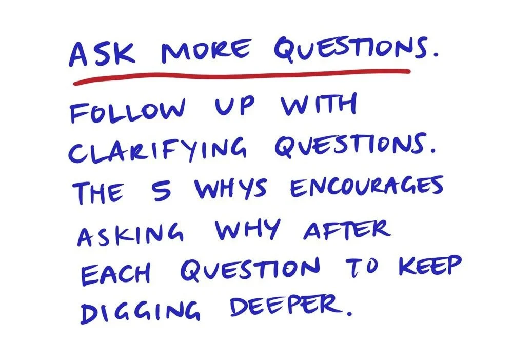 Ask more questions. Follow up with clarifying questions. The 5 whys encourages asking why after each question to keep digging deeper.